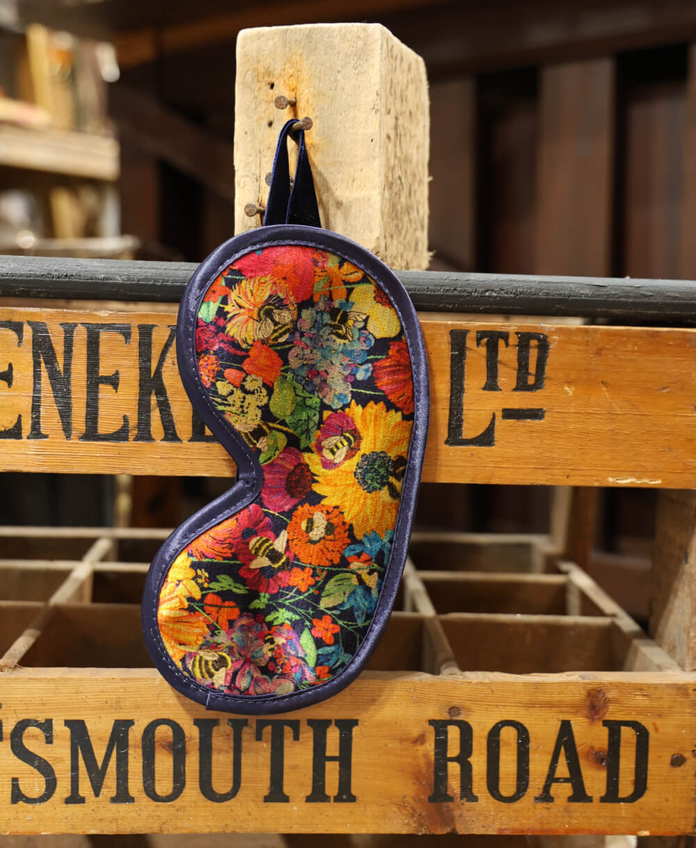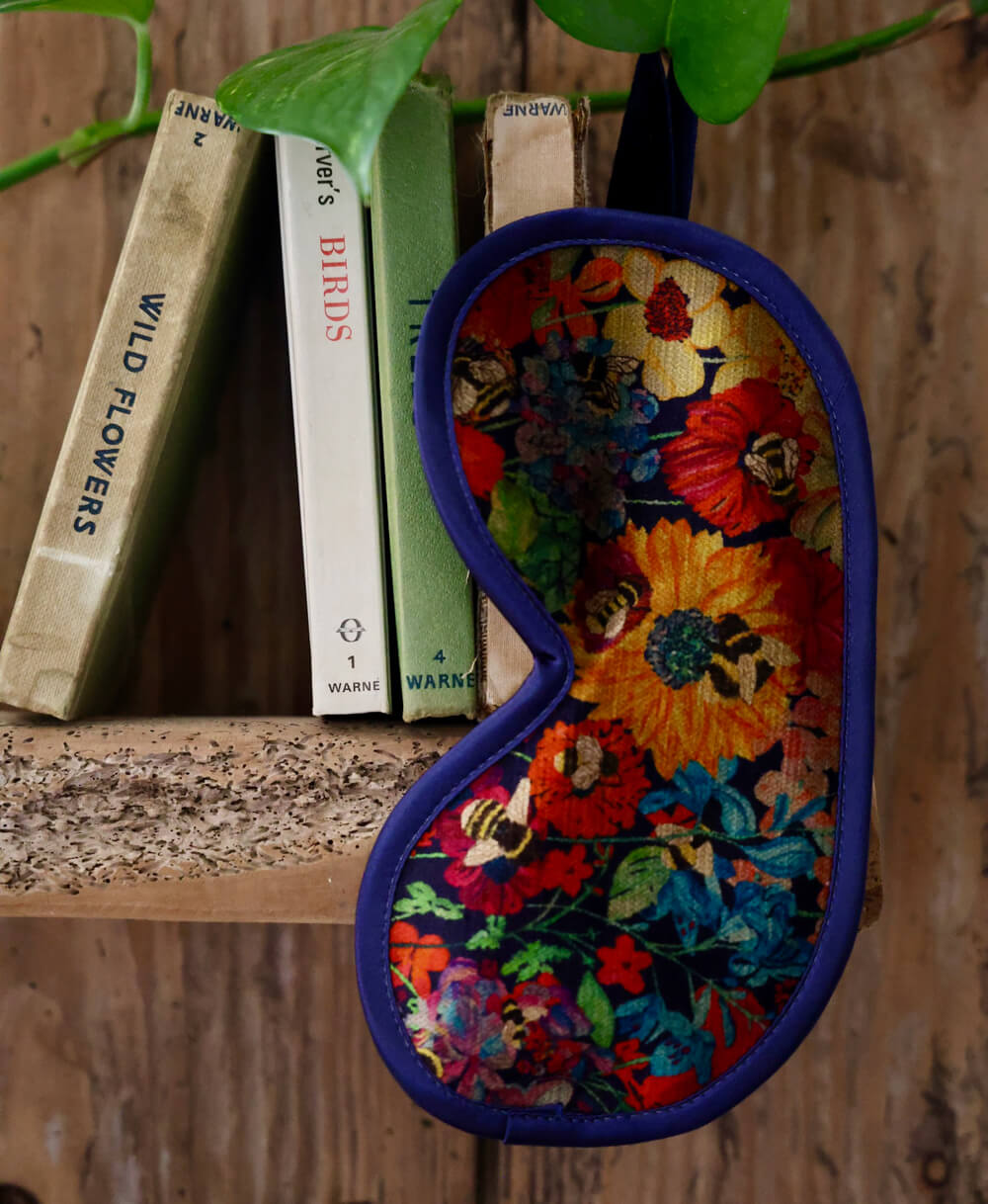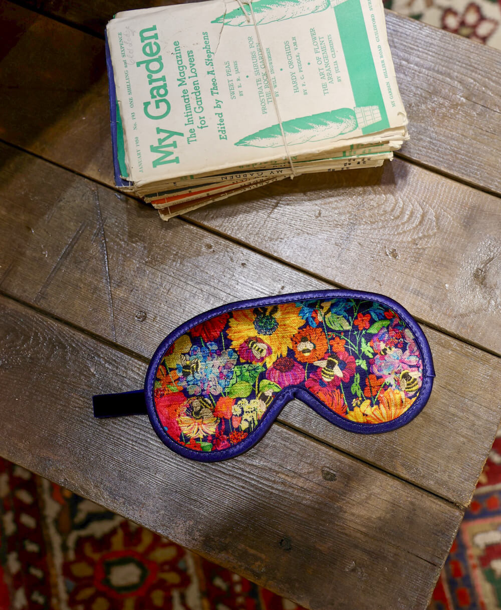 Enjoy a peaceful night's sleep with this soft and silky eye mask in Bumblebee Garden, Mini Midday Sun. The perfect travel companion, these little luxuries are made from plush vintage velvet to help you feel relaxed and pampered.
