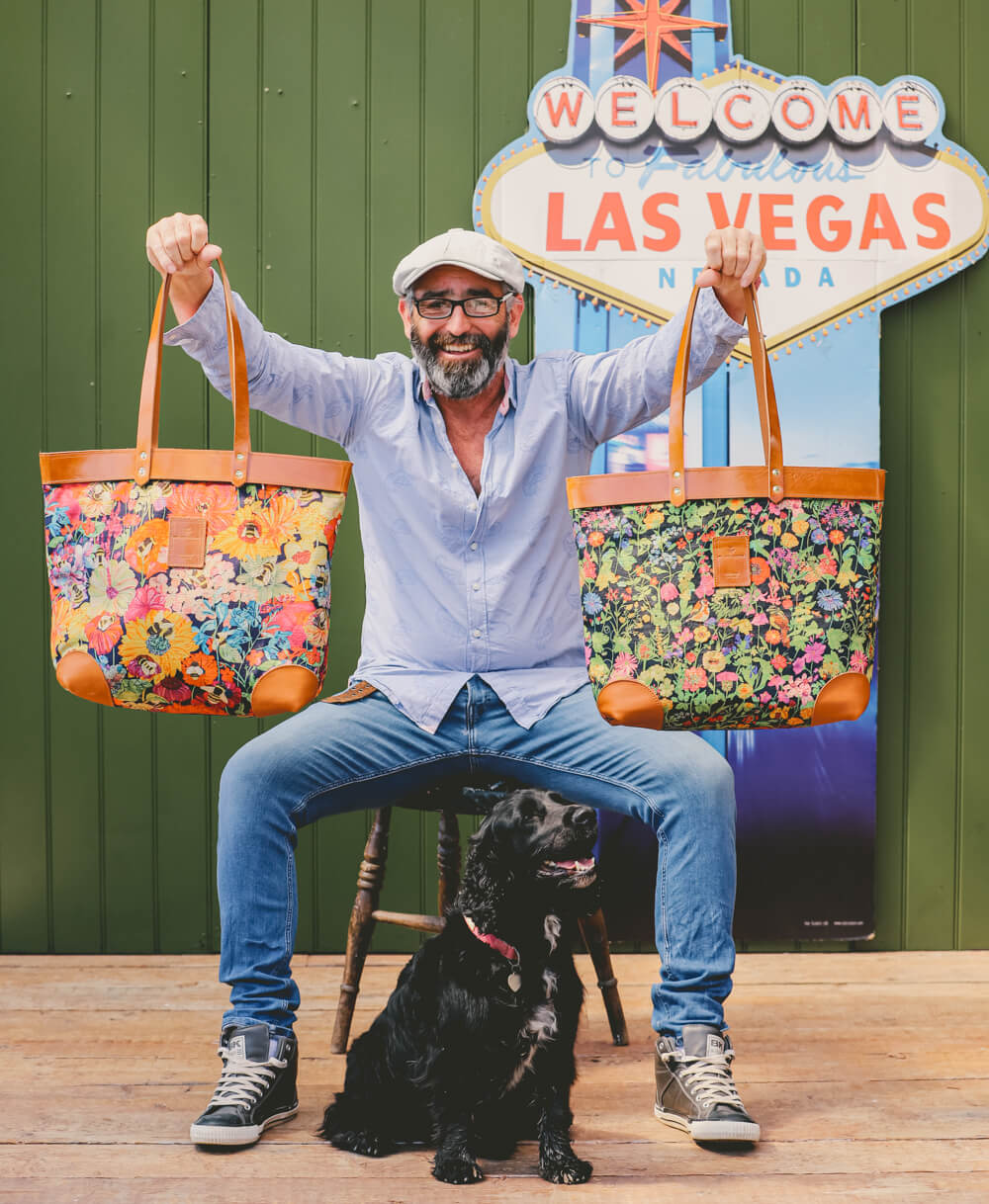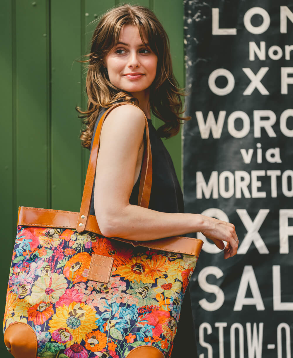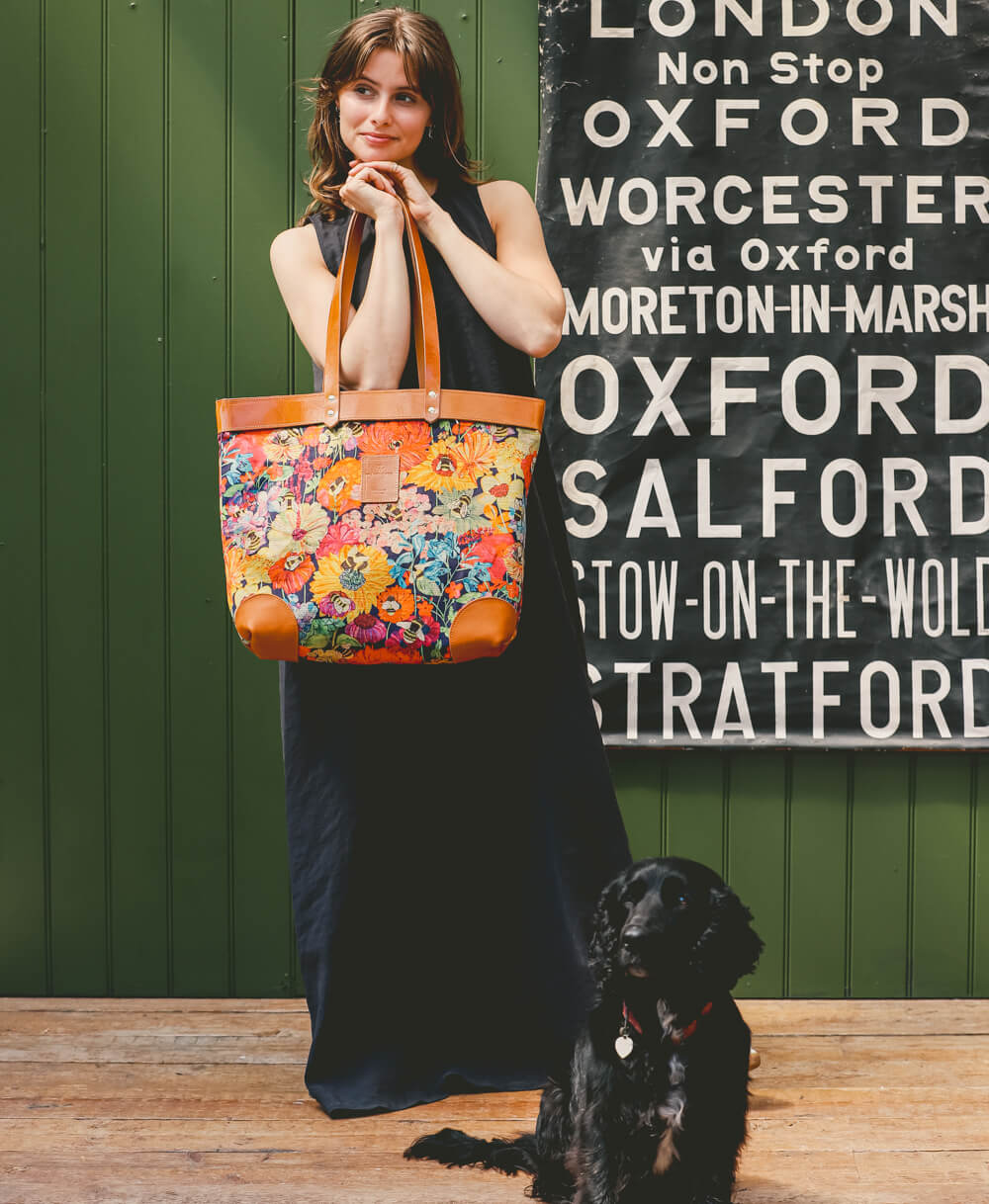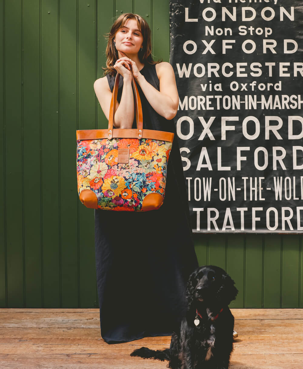 Offered in two sizes and a contrasting range of fabrics, they feature an internal pocket and are finished with leather handles and trim.